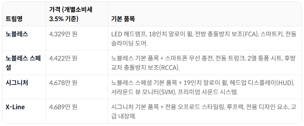 - **노블레스**: 기본 사양이 충실하며, 가족용으로 적합한 가성비 트림입니다.
