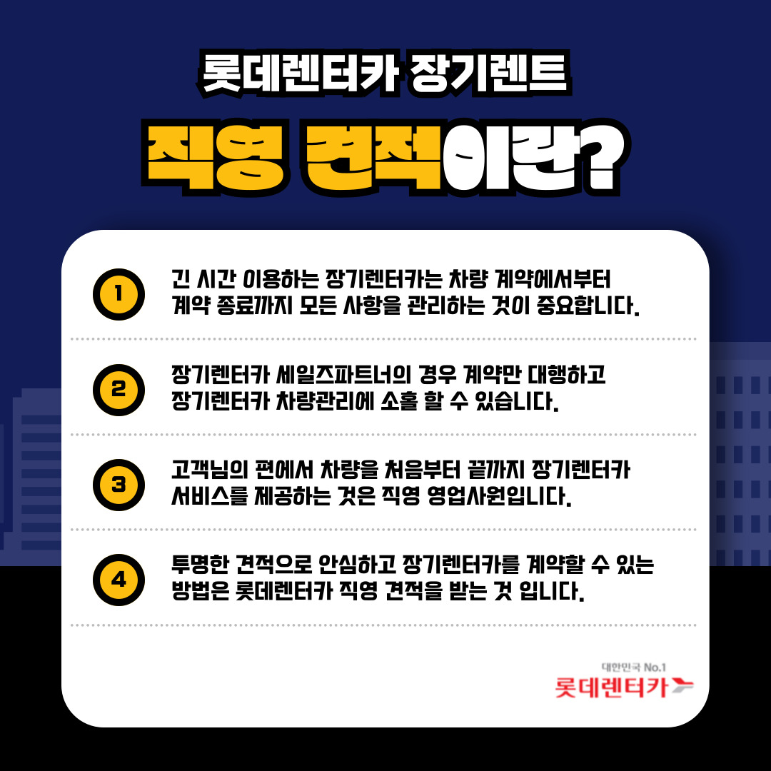 저는 일반 영업사원이 아닌 **롯데렌터카 본사 직원**입니다. 영업 수수료 없이 견적을 제공하기 때문에, 동일 조건 대비 **최저가 견적**을 약속드릴 수 있습니다.